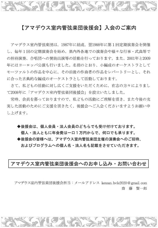 さて、私どもの活動に対し広くご支援をいただくために、有志の方々によりまして2008年に「アマデウス室内管弦楽団後援会」を設立いたしました。